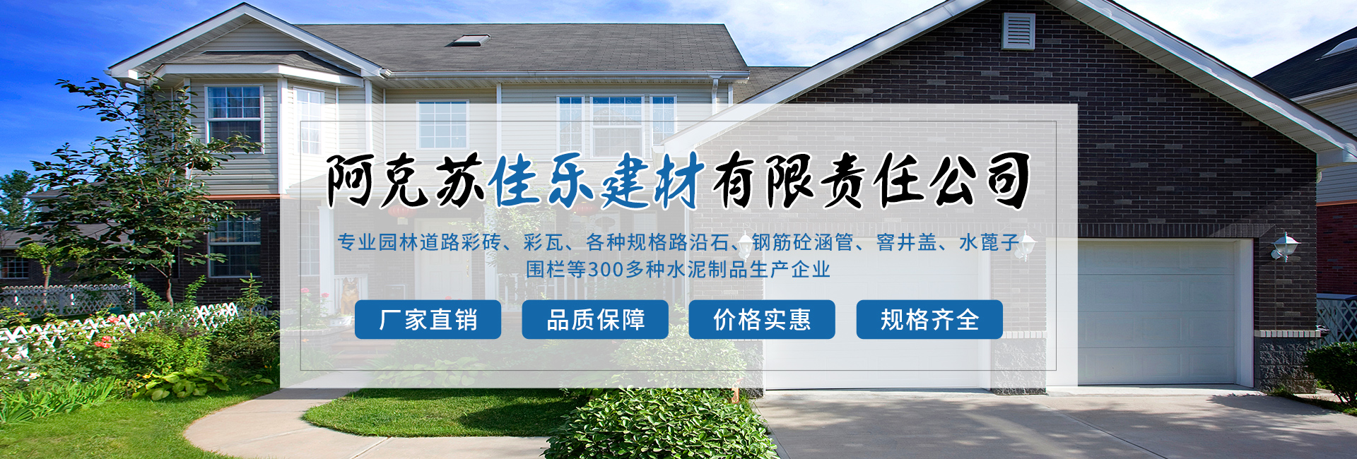 阿克苏佳乐建材有限责任公司成立于2005年,是园林道路彩砖、彩瓦、各种规格路沿石、钢筋砼涵管、窨井盖、水蓖子、围栏等300多种水泥制品生产企业。阿克苏佳乐建材有限责任公司位于阿克苏市塔南路13号(石油公司往南200米)。现公司在阿克苏市、阿瓦提县、乌什县、拜城县、轮台县、焉耆县等地有分厂十余个,为地方城乡建设添砖加瓦。 多年来,公司致力于设备的更新,新产品的研制,用更科学更美观的产品顺应...